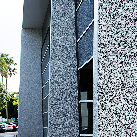 The Precast Concrete fins are manufactured using Monarc's Pacific Oyster Concrete Colour. Fins are then enhanced with Monarc's 5000 grade Diamond Honed surface finish to both faces of the panels. Visible panel edges are Hand Diamond Honed revealling the beautiful contrast of black and white 10mm aggregates.