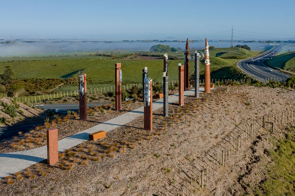 Bridging the gap between culture and community, Waikato expressway see's Concrete Pou and Waka erected on historic sites throughout the new State Highway-1 Huntly bypass route.