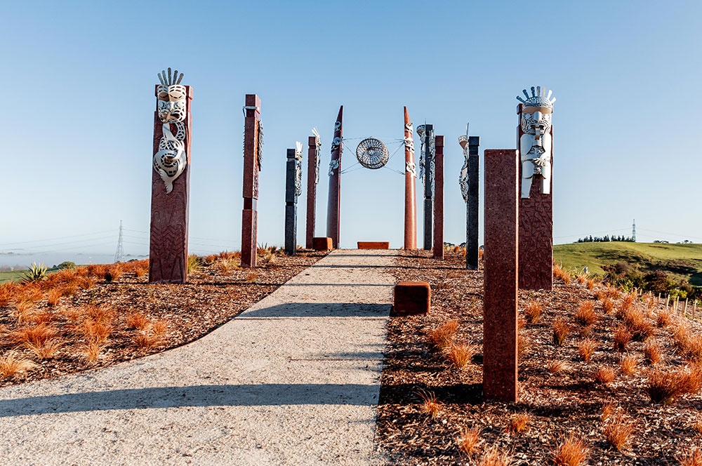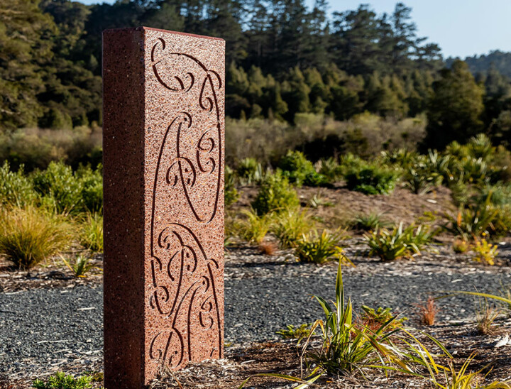 Leveraging Red and Black concrete representative of Historic carvings, Precast Pou designs we created by Master Maori Carver Warren McGrath to represent the multiple Maori tribes of the region coming together in harmony at a Key Historical location of interest.